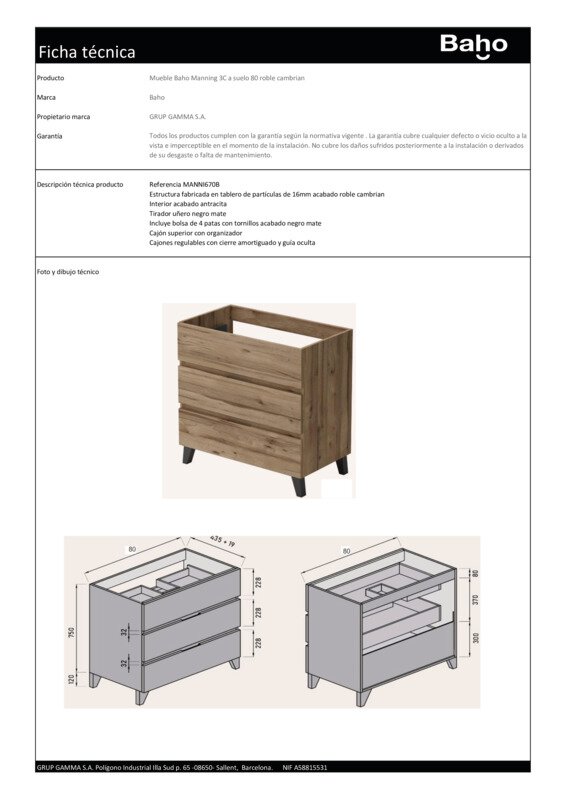 El mueble de baño a suelo Mueble de baño Baho Manning 3C a suelo 80 roble cambrian está diseñado para quienes buscan estabilidad, capacidad y un diseño atemporal en el baño. Su instalación apoyada en el suelo proporciona una sensación de solidez, ideal para baños familiares o de uso intensivo. Fabricado en tablero de partículas de 16 mm, incorpora trasera de DM de 3 mm y un interior en acabado antracita, garantizando resistencia y durabilidad en el uso diario. El acabado roble cambrian destaca por su estética natural y elegante, perfecta para crear ambientes acogedores y equilibrados. Dispone de 3 cajones amplios con guías ocultas y sistema de cierre soft close, asegurando un deslizamiento suave y silencioso. El cajón superior incluye sistema salvasifón, optimizando el espacio interior sin renunciar a capacidad de almacenaje. Incluye patas para su instalación a suelo, facilitando el montaje y aportando estabilidad y seguridad al conjunto.