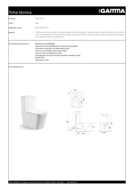 La taza de WC compacto de la serie ERIO de Baho es perfecta para darle un toque moderno y distintivo a tu baño, gracias a su diseño cuadrado. Además, gracias a su diseño carenado, totalmente fijado a pared, evitarás los rincones difíciles de limpiar y te garantizarás la facilidad para mantener el exterior de tu inodoro higienizado. Para la limpieza del interior, el baño dispone de tecnología Rimless con la que desaparecen las tradicionales bridas y el agua se descarga directamente desde un distribuidor evitando la acumulación de bacterias, la descarga se distribuye de forma más homogénea llegando a más rincones y aprovechando mejor cada litro de agua consumido. También dispone de tecnología nano Glaze en la superficie del material, un tratamiento que cierra los poros del mismo evitando que se adhieran bacterias y suciedad. El inodoro incluye tapa de cierre amortiguado intercambiable con la tapa extrafina y amortiguada ERIOB040B. Es compatible con la cisterna ERIOB010B, no incluida, que dispone de alimentación inferior y mecanismo de descarga dual de 2,3 y 4,5l, por lo que este inodoro además te ayudará a ahorrar agua. Tiene salida dual a pared o a suelo e incluye codo de conexión. Sus medidas son 36 cm de ancho x 54 de fondo hasta la cisterna (64 cm con la cisterna) y el asiento hace 41 cm de alto.